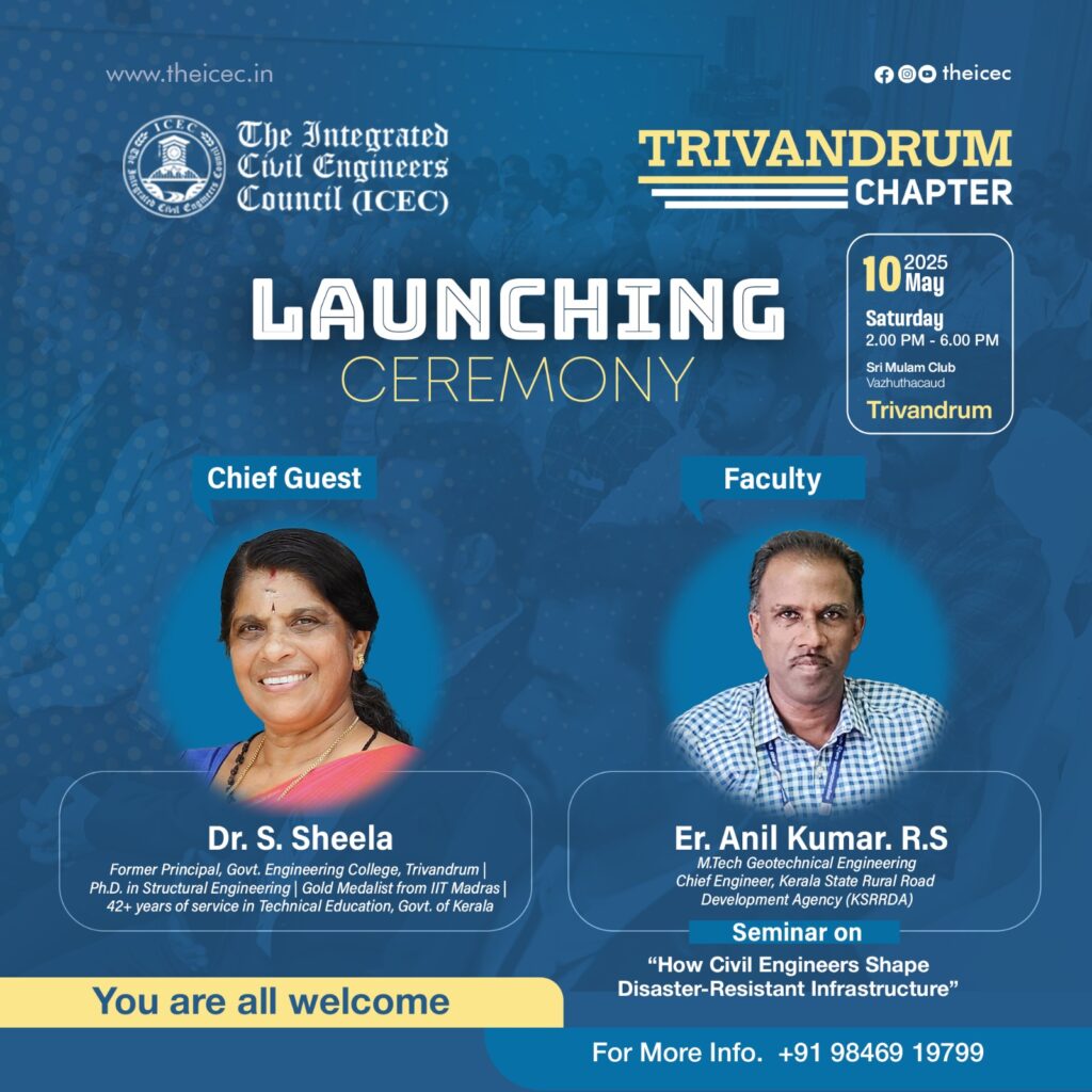 We are delighted to invite you to the launching ceremony of the ICEC Trivandrum Chapter, organized by The Integrated Civil Engineers Council (ICEC). The event will take place on Saturday, May 10, 2025, from 2:00 PM to 6:00 PM at Sri Mulam Club, Vazhuthacaud, Trivandrum. This special occasion marks a significant milestone in our journey, and we sincerely request your presence, blessings, and prayers to make it even more memorable. Join us as we celebrate the beginning of a new chapter dedicated to advancing the civil engineering community.